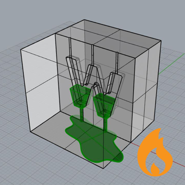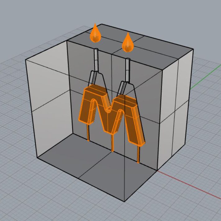 3D-Druck Deines 3D Volumens mit MOLDLAY Wachsfilament oder MakeX M-Cast Kunstharz. Das Wachsmodell wird mit flüssigem Stein, z.B. Gips übergossen. Das eingebettete Wachsstück wird in einem Ofen aus dem getrockneten Gips ausgeschmolzen. Das Wachs brennt 100 % rückstandlos aus. Das ausgeschmolzene Wachs hinterlässt ein Negativ des ursprünglichen Wachsmodells. Flüssiges Metall wird in den Hohlraum gegossen. Nach dem Kühlen, wird der Gipsstein aufgebrochen. Reste des Gips werden mit Säuren entfernt. Durch polieren, schleifen, schmirgeln und/oder Beschichtung wird der Metallrohling fertiggestellt.
